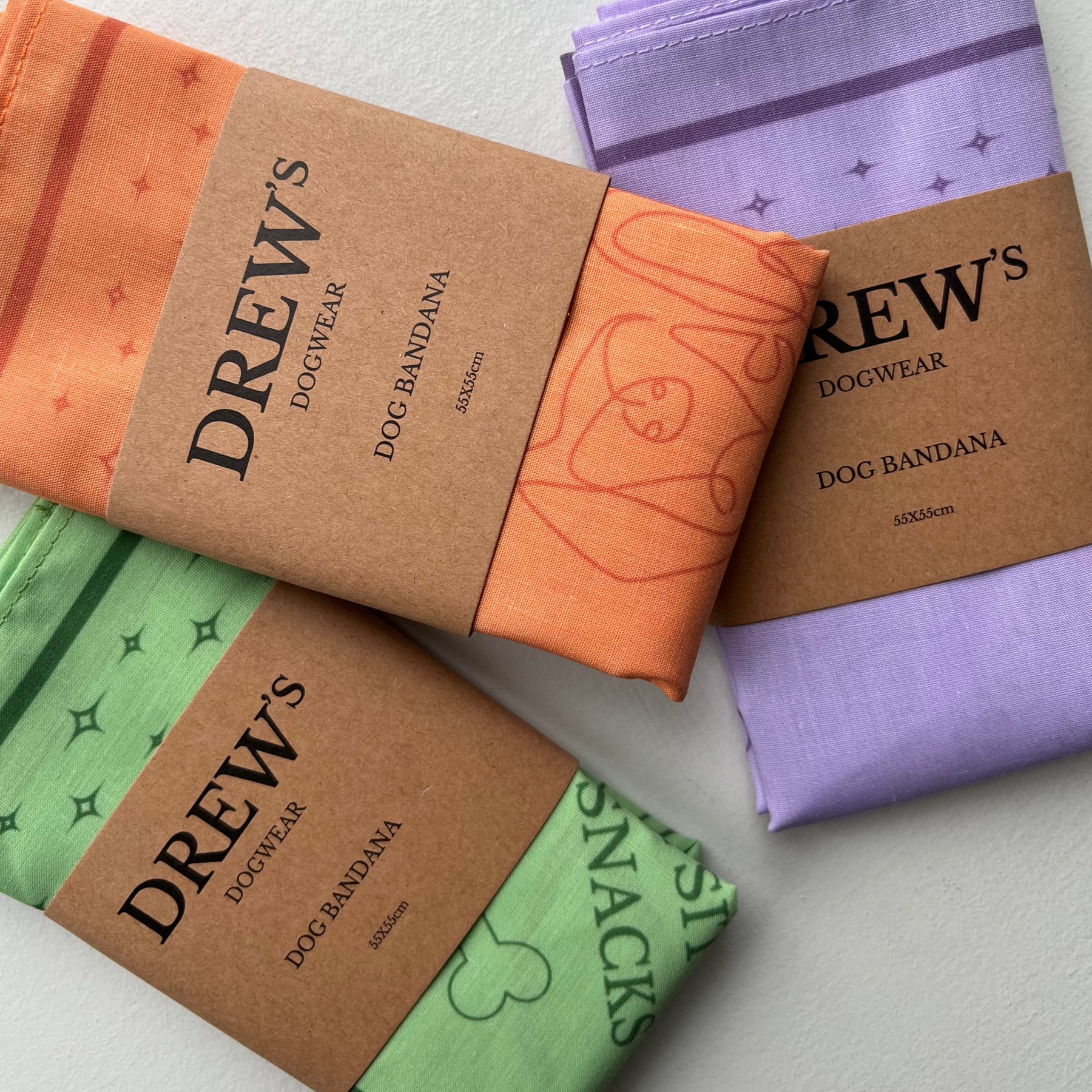 Sæt af grøn, orange og lilla bandana til hunde